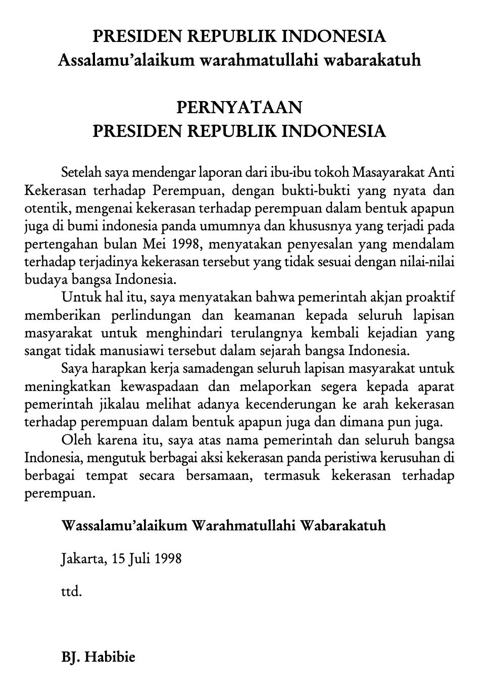 Third, we have the public apology issued by then-President B. J. Habibie, who formally recognized and apologized for the suffering of the victims. Are we to believe that a sitting president would apologize for something that “never happened”? To deny the events today is to imply that Indonesia’s third president deliberately lied, that he coordinated with fact-finding teams, civil society groups, and survivors in a calculated effort to mislead the public. This isn’t just a historical lie. It’s a political absurdity.