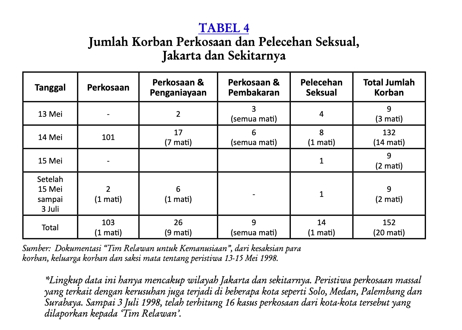 Second, there is the official report by the Tim Gabungan Pencari Fakta (TGPF), a fact-finding team that documented numerous cases of sexual violence, including rape and harassment, during the May 1998 riots.